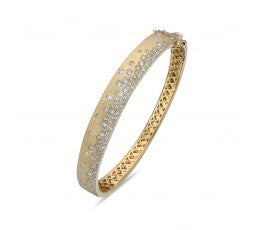 This stunning diamond flush set bangle features brilliant scattered diamonds with 1.88 cts in a 14K yellow gold satin finish. wear it alone as a statement piece or stack it with other favorite bracelets to express your style.