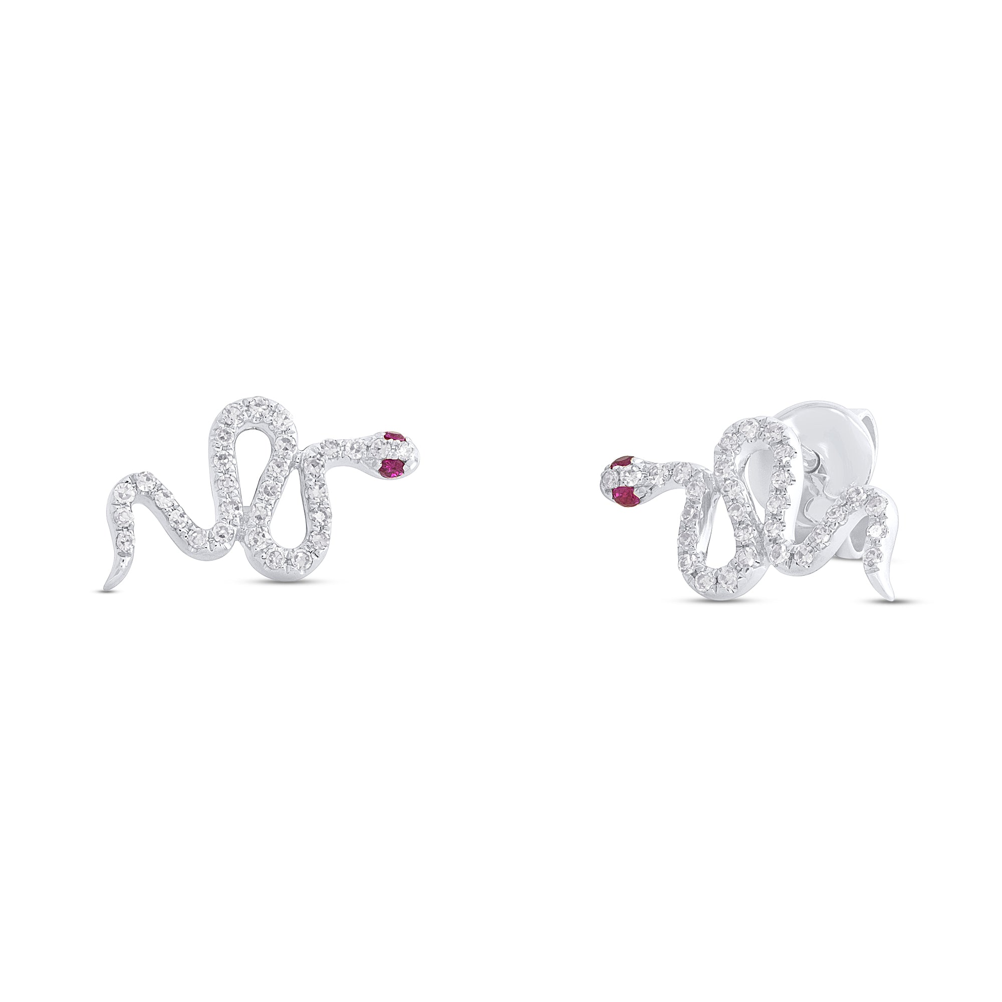 These contemporary 14K white gold snake studs feature handset pave diamonds and two ruby stone eyes. Switch up your everyday studs with these stuning diamond snake earrings to elevate your collection of contemporsary jewelry.