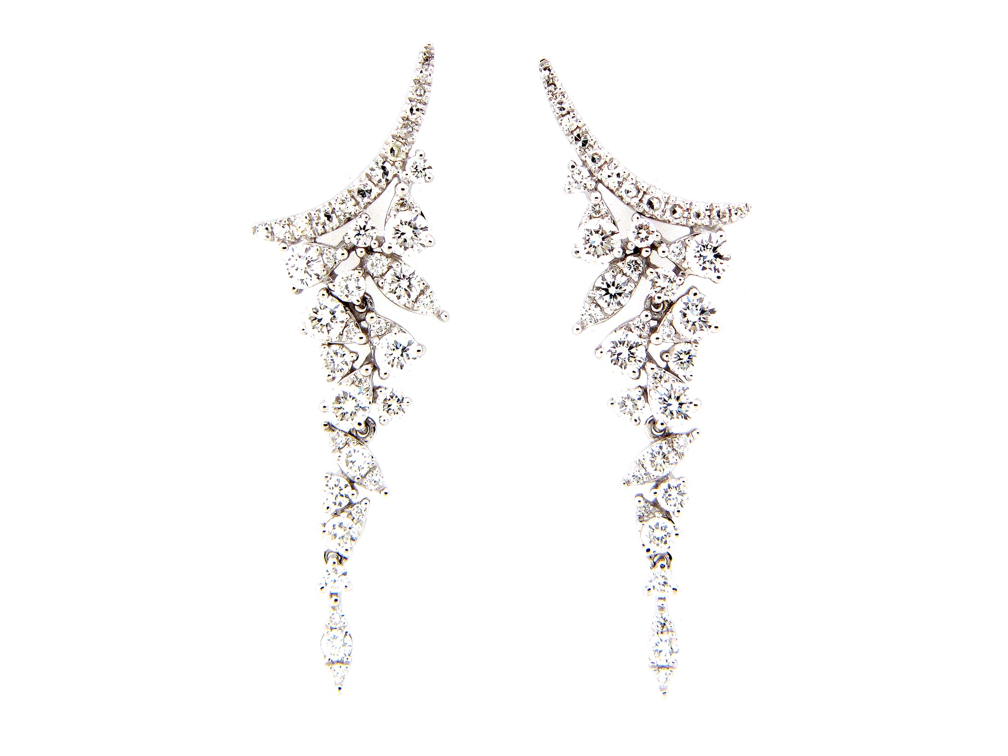 Graduated round diamonds in a splendid cascading pattern are set in marquis and pear shaped settings. These alluring drop earrings crafted in 14K white gold, look ethereal and dazzling.