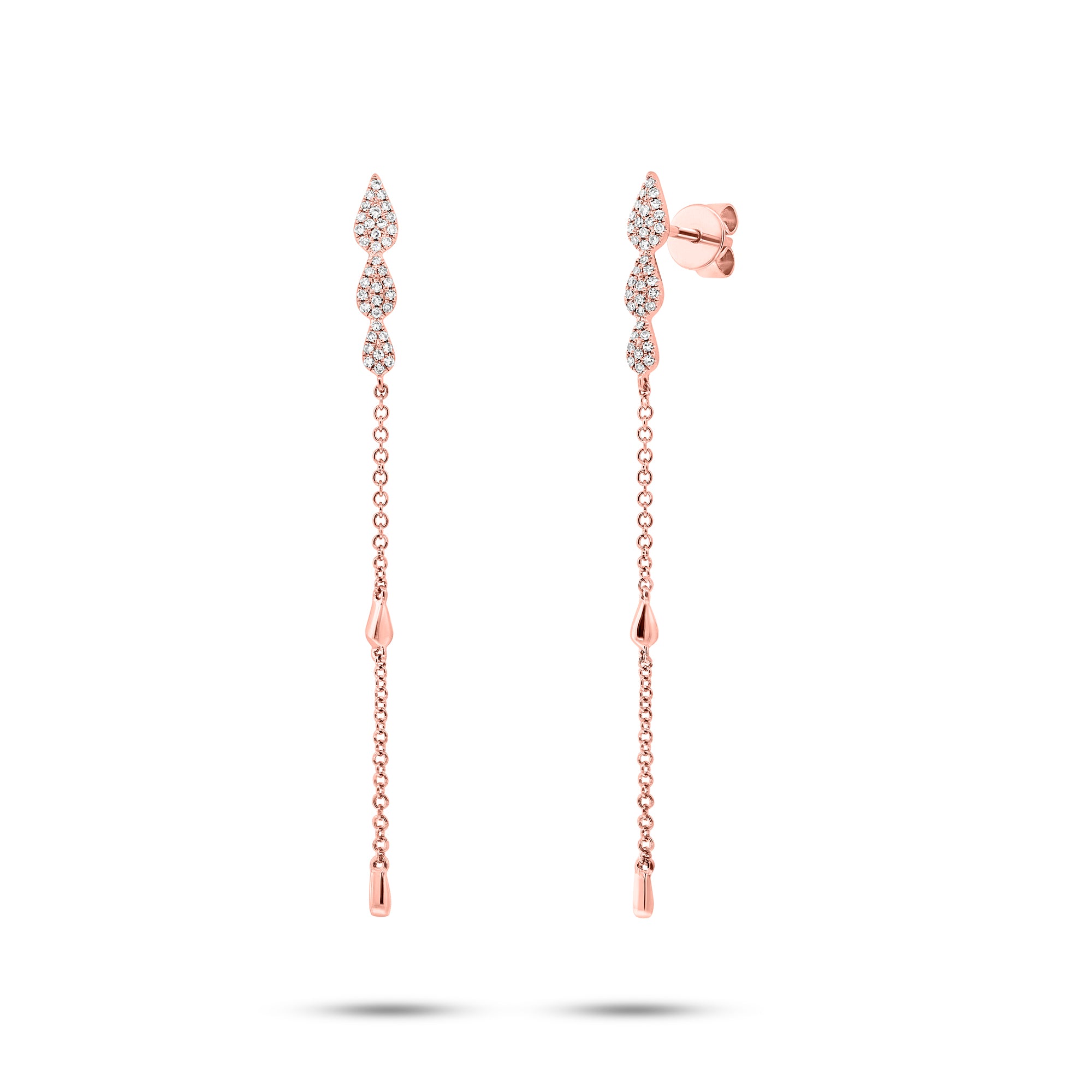 These rose gold dimaond earrings have a delicate look with a long chain in 14K rose gold dangling from 3 graduated teardrops of pave diamonds.