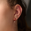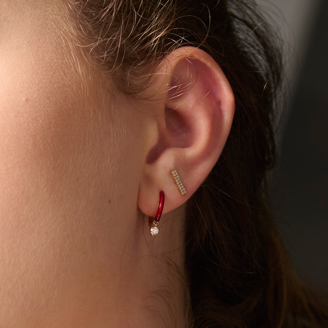 A sleek and sophisticated red enamel over 14K gold huggie is enhanced by a stunning floating diamond. Guaranteed to make a lasting impression.