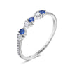 This shimmering sapphire and diamond stackable band is crafted in 14K white gold, featuring 3 round sapphires, 3 round diamonds, and diamond accents cascading down the shoulders.