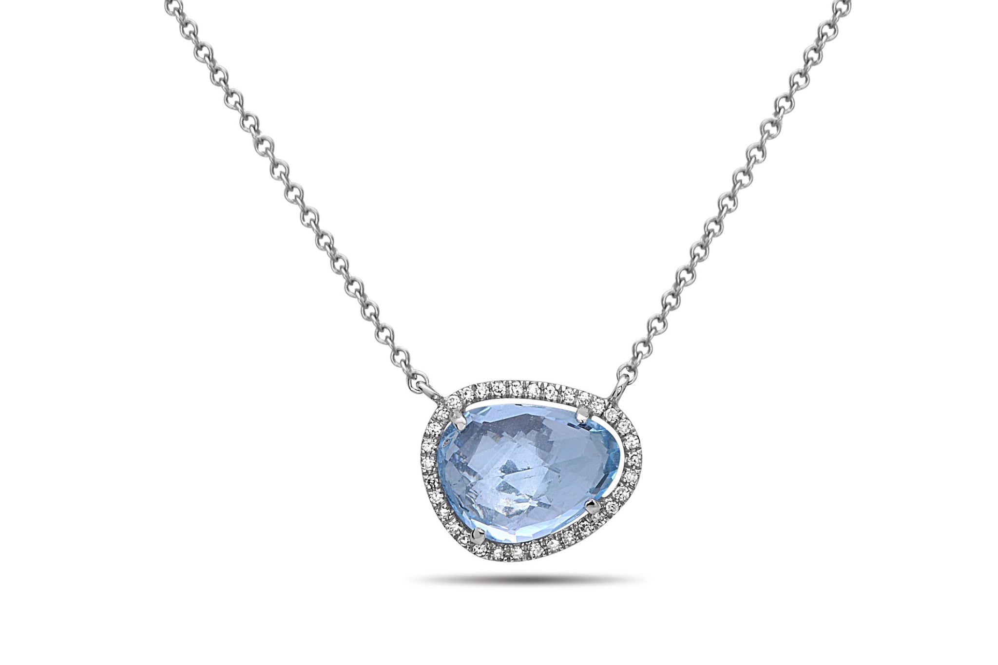 Surrounded by a glittering halo of diamonds this glimmering rose cut bean blue topaz pendant is set in 14K white gold and features 2.38 cts blue topaz, and 0.08 cts diamonds.