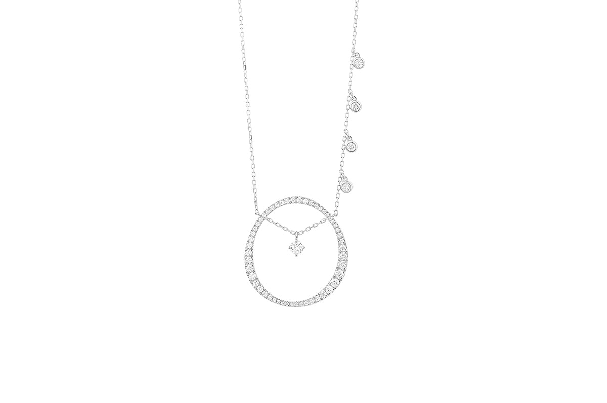 This 14K white gold open circle diamond necklace features sparkling diamonds that radiate unmatched brilliance in its unique design.