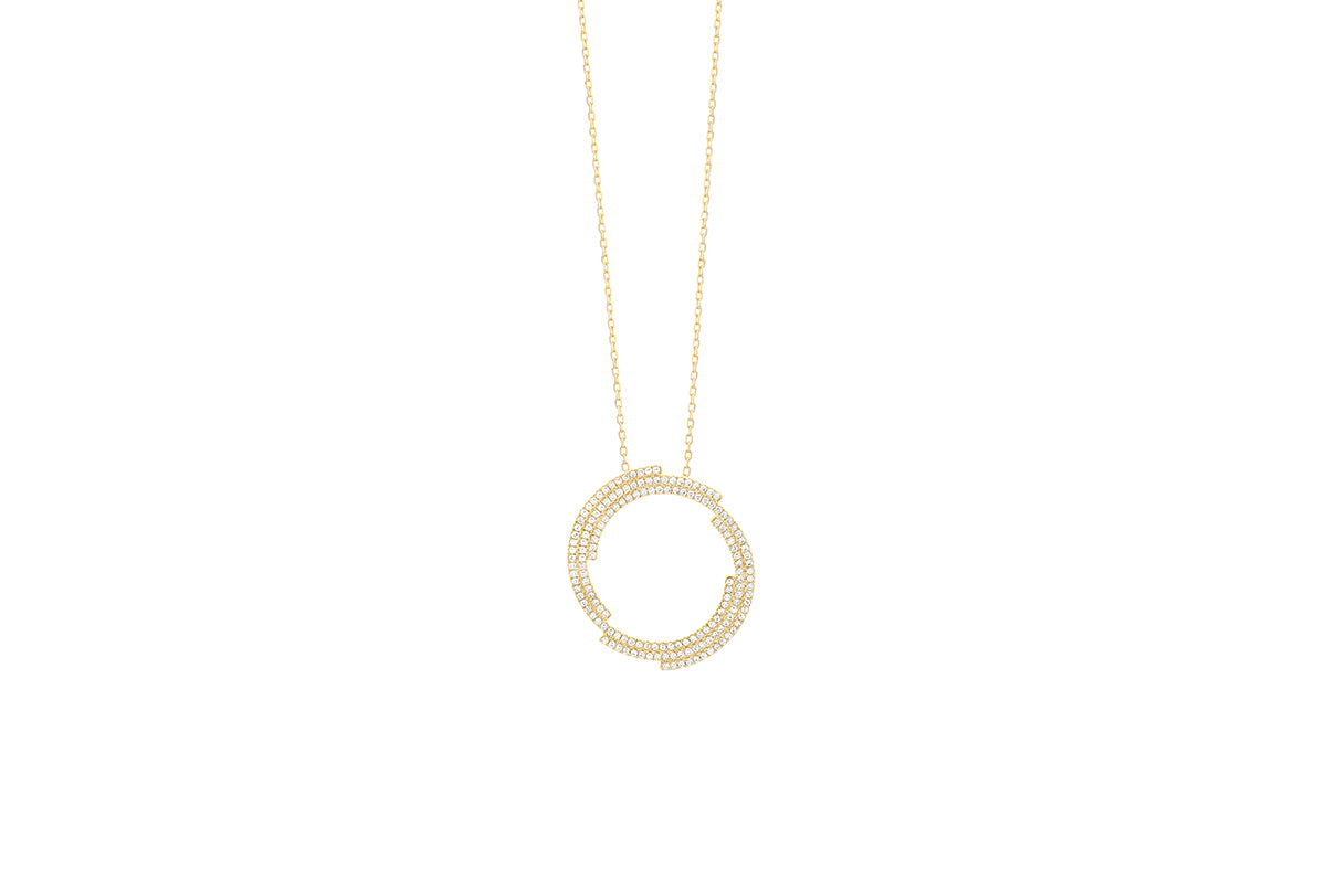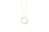 This 14k yellow gold open circle pendant is accentuated with radiant diamonds in a unique sophisticated design.