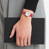 With its harmoniously designed polished stainless steel case and 26mm diameter, this Mondaine evo2 is a watch for small delicate wrists and is very comfortable to wear. The sapphire crystal protects the iconic dial with the prominent red second hand. Thanks to its minimalistic design the watch is highly readable. The iconic Mondaine dial with date indication and the red vegan strap add the finishing touches. The watch has a vegan grape leather strap in red which consists of 75% eco-friendly plant-based composite material and 25% recycled PET.